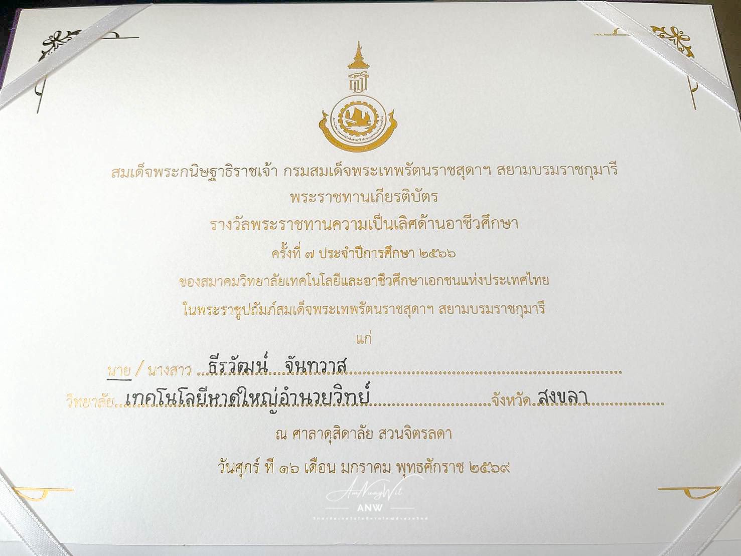 ✨💐ขอแสดงความยินดีกับนายธีรวัฒน์ จันทวาส นักศึกษาระดับ ปวส. 2/7 สาขาเทคโนโลยีสารสนเทศ เข้ารับรางวัลพระราชทาน "ความเป็นเลิศทางวิชาการอาชีวศึกษา" จากสมเด็จพระกนิษฐาธิราชเจ้า กรมสมเด็จพระเทพรัตนราชสุดาฯ สยามบรมราชกุมารี ณ อาคารชัยพัฒนา สวนจิตรลดา พระราชวังดุสิต กรุงเทพมหานครฯ พร้อมกันนี้ อาจารย์พิมพ์ชนก ณ พัทลุง ผู้อำนวยการ ได้เป็นตัวแทนวิทยาลัยฯ นำนักศึกษาเข้ารับรางวัลพระราชทาน 🩵🩷